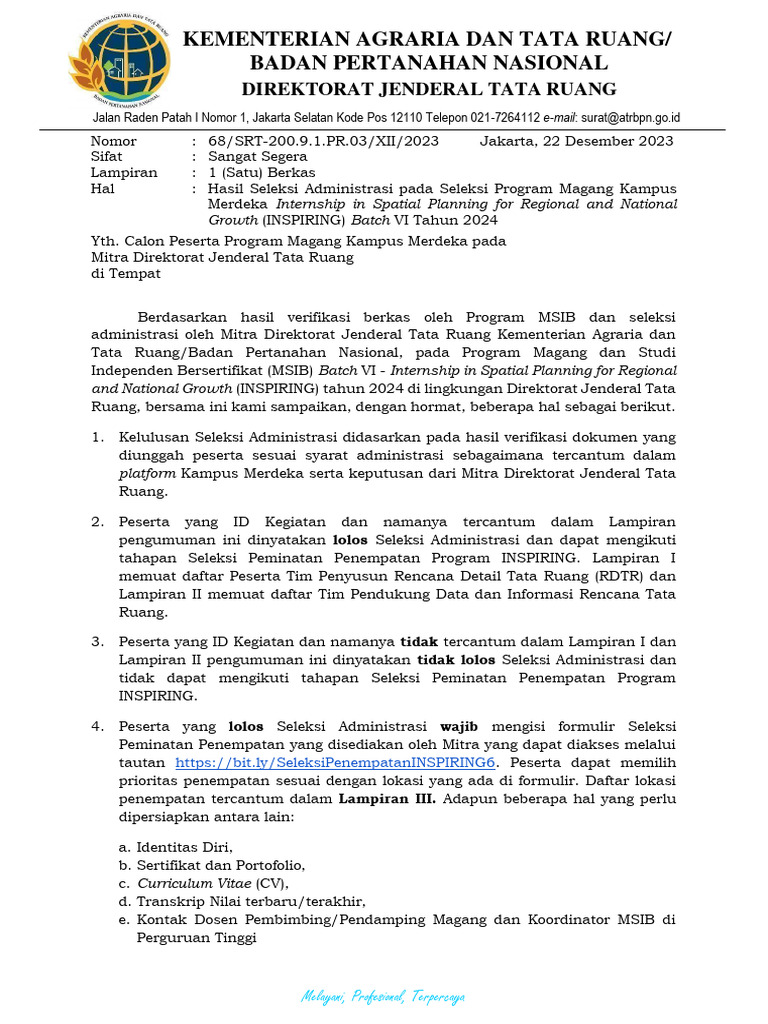 Peserta yang lolos seleksi akan mendapatkan informasi lengkap mengenai perusahaan tempat magang, posisi, dan jadwal pelaksanaan kegiatan.