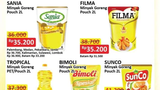 – SOVIA: Minyak Goreng Pouch 2L – Pulau Jawa dan Medan harga awal Rp44.700, jadi Rp37.500 (hemat Rp7.200).
