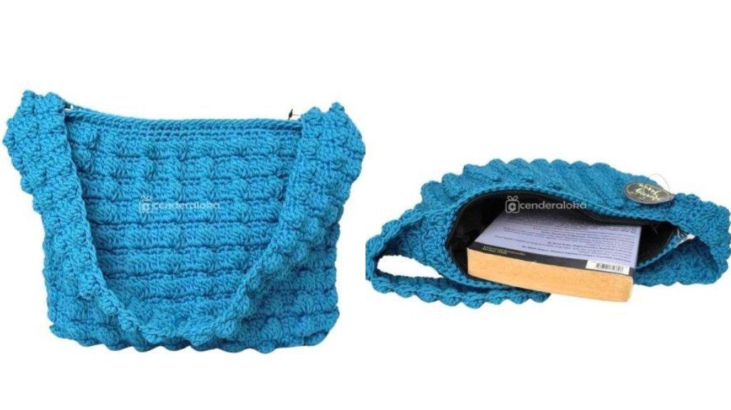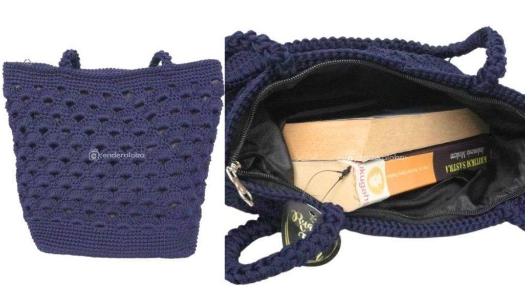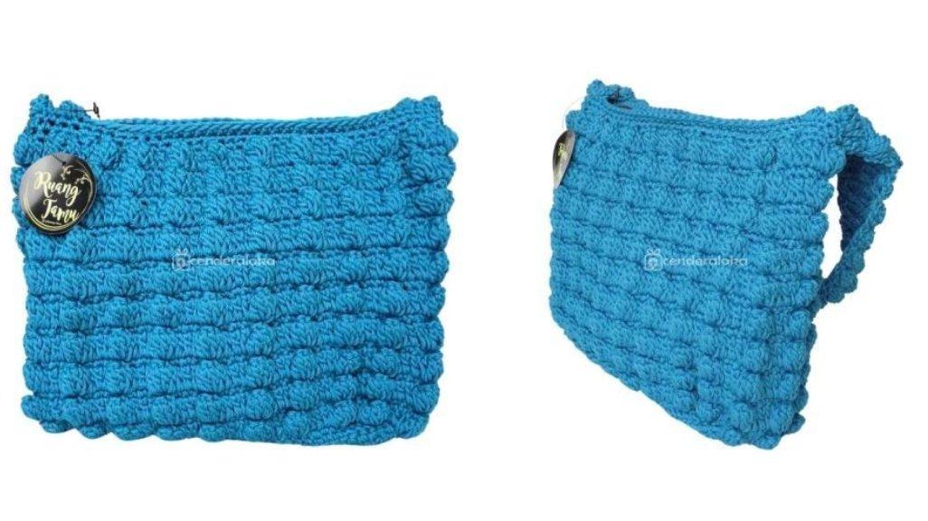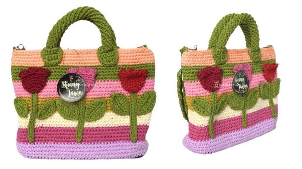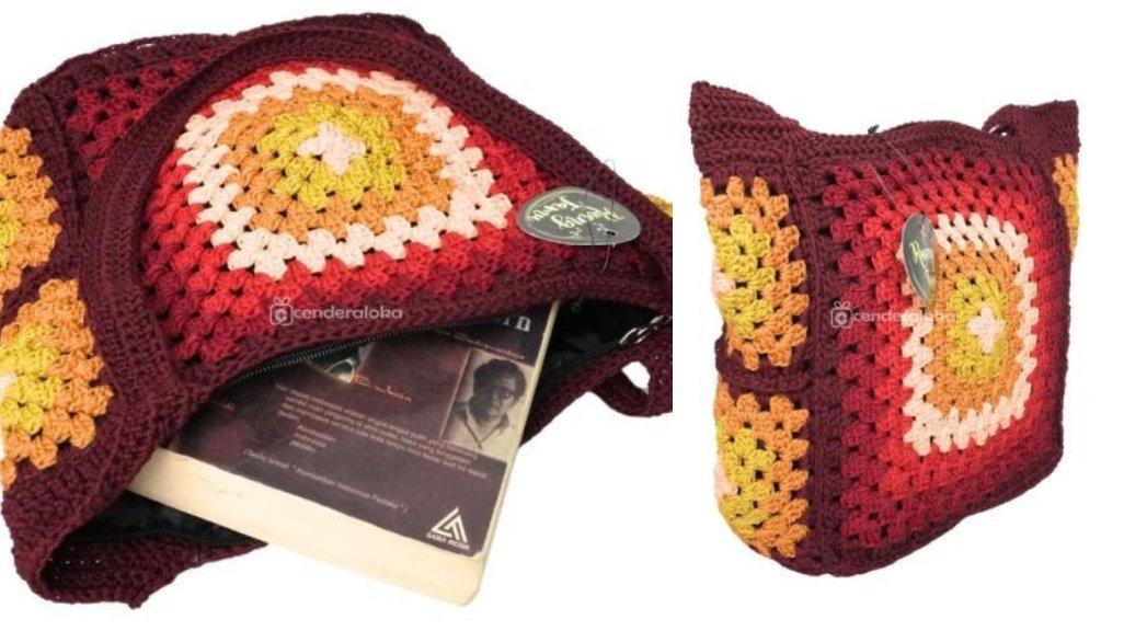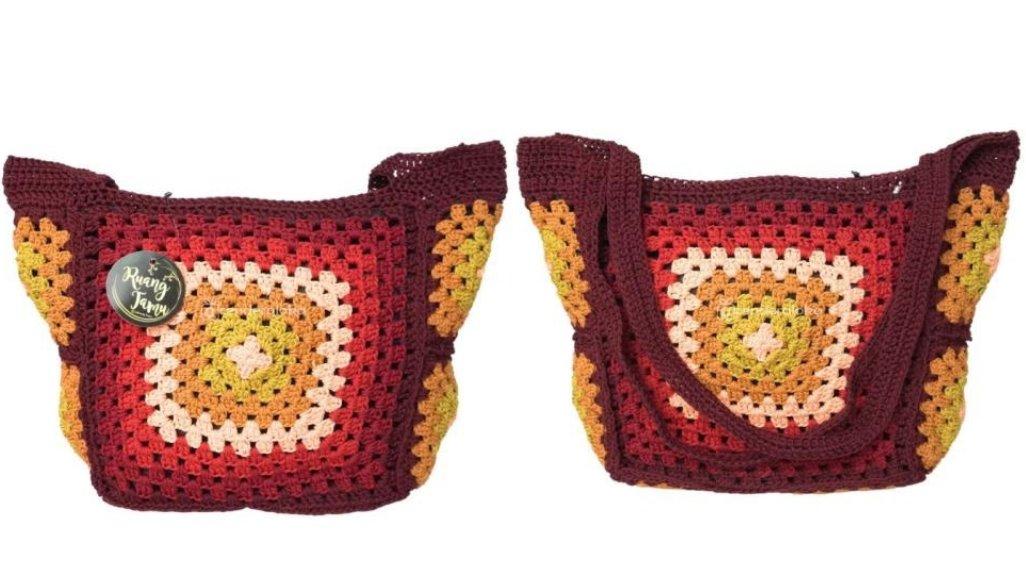 Tas ini merupakan hasil karya perajut Indonesia yang sepenuhnya dibuat secara handmade. Dibuat dari bahan Polythick Premium, tas ini memiliki furing satin premium yang tahan air. Keunikan dari tas ini adalah adanya resleting, yang membantu mengurangi risiko barang bawaan terjatuh atau tercecer. Ukuran medium dari tas ini adalah 26 x 22 cm dengan toleransi sekitar 3 hingga 4 cm.