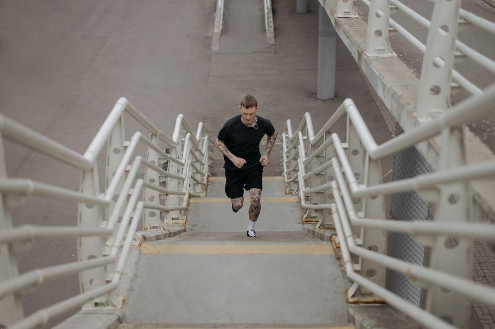Berjalan, lari cepat, atau menaiki tangga bisa membakar kalori dalam jumlah besar. Orang dengan berat badan 68 kg yang berlari menaiki tangga selama 1 jam bisa membakar 1.000 kalori. Tips melakukannya: mulai dengan jalan menaiki tangga, mulai dengan melangkahi setiap dua anak tangga, naiki tangga sambil melakukan gerakan lunge, variasikan forward lunge dan lateral lunge, akhiri set dengan lari menaiki dan menuruni tangga satu kali. Istirahat 10 detik dan lakukan set kedua. Durasi yang disarankan adalah 10 menit dengan perkiraan 200 kalori yang dibakar.